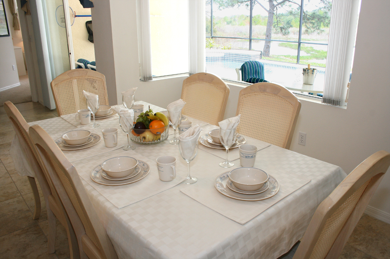 The dining area has a table and seven chairs with picture window overlooking the pool area.