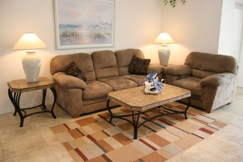 Large sliding doors lead from the living area to the lanai, patio and pool area. An overhead fan helps with air circulation.